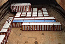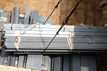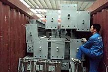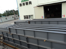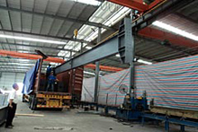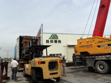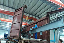 做一个底架,把所有的钢柱、钢梁都堆在钢架上,然后用钢丝绳固定,然后用吊机吊起来,用大型叉车推到货柜里面去,这种装运方式比较快,而且方便,一般建议用40'HQ和40'OT来装。如图所示: