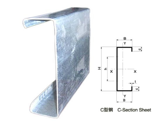 C steel was processed after hot rolling and cold bending. Its characteristics are: thin wall, light weight, good cross section performance, high strength (compared with the traditional steel) and can save 30% materials compared with the equivalent steel.