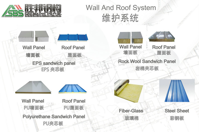 The steel structure panel material included EPS sandwich panel,Rock wool sandwich panel,PU sandwich panel,fiber-glass ,steel sheet.
